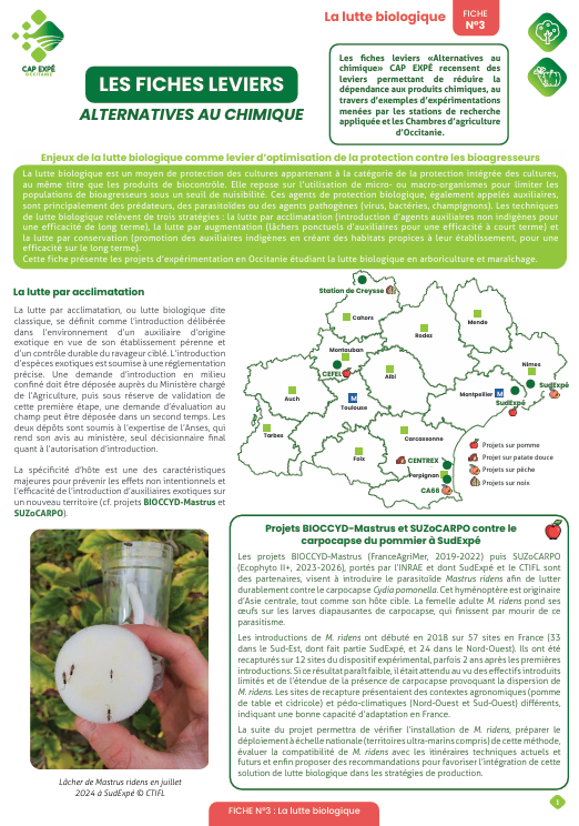 Cette fiche présente les projets d’expérimentation en Occitanie étudiant la lutte biologique en arboriculture et maraîchage.