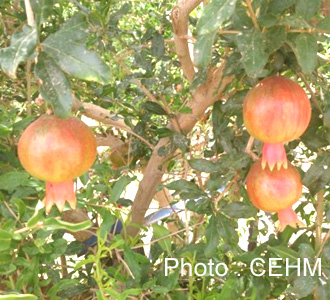 - Fruit : sphérique à péricarpe épais surmonté des restes d’un calice dentelé très résistant. L’épicarpe et le mésocarpe sont fibreux. Le fruit est d’abord vert, puis ivoire-rougeâtre. Il y a une variation en pleine maturité du jaune brun au rouge terne marbré de points plus vifs ou foncés. Les fruits sont portés par les bois de 2 ans et plus. L’intérieur du fruit est divisé par des cloisons en loges. Chaque loge contient des graines anguleuses « arilles » enveloppées d’une pulpe rose grenat. Il y a environ 400 arilles par grenade soit en moyenne 55 % du poids total du fruit. La pulpe est juteuse, sucrée-acidulée.