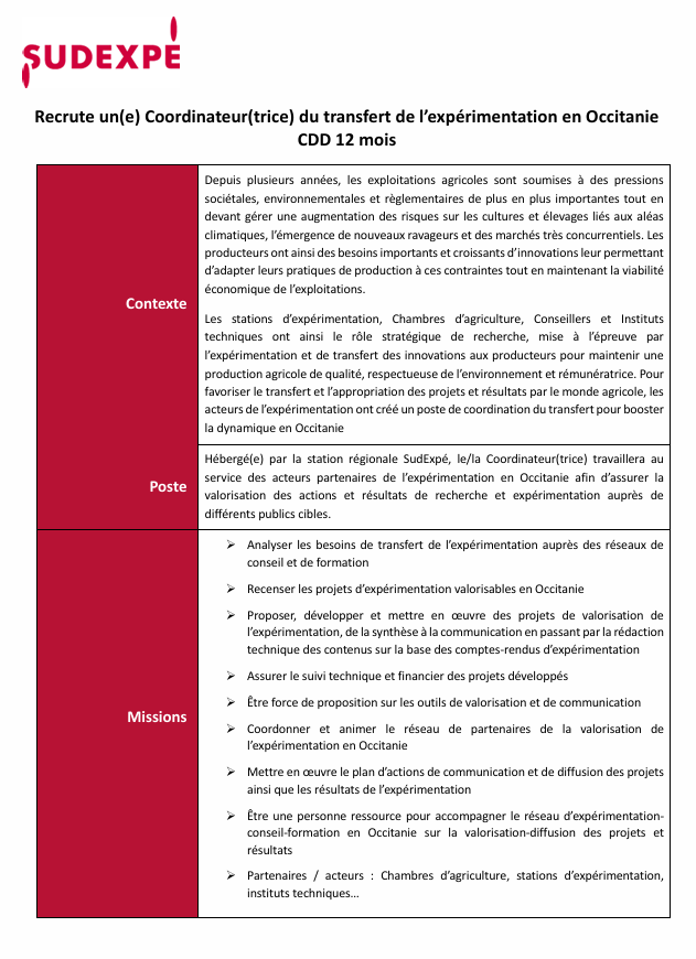 Recrutement>Offre d’emploi CLOTURE - Recrute un(e) Coordinateur(trice) du transfert de l’expérimentation en Occitanie CDD 12 mois SudExpé recrute un(e) Coordinateur(trice) du transfert de l’expérimentation en Occitanie CDD 12 mois Offre Coordinateur(trice) du transfert de l’expérimentation en Occitanie