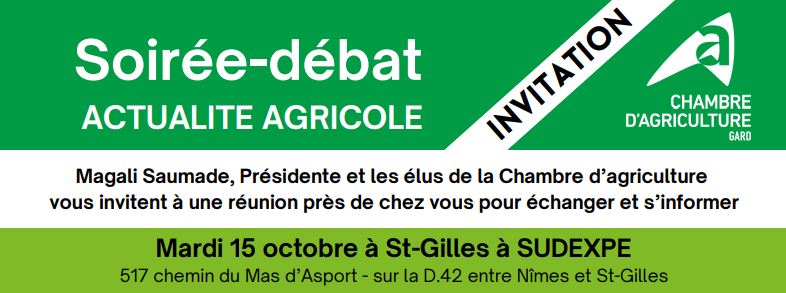 Magali SAUMADE, Présidente de la Chambre d’Agriculture du Gard et ses élus sont heureux de vous inviter à la soirée-débat sur l’actualité Agricole.
