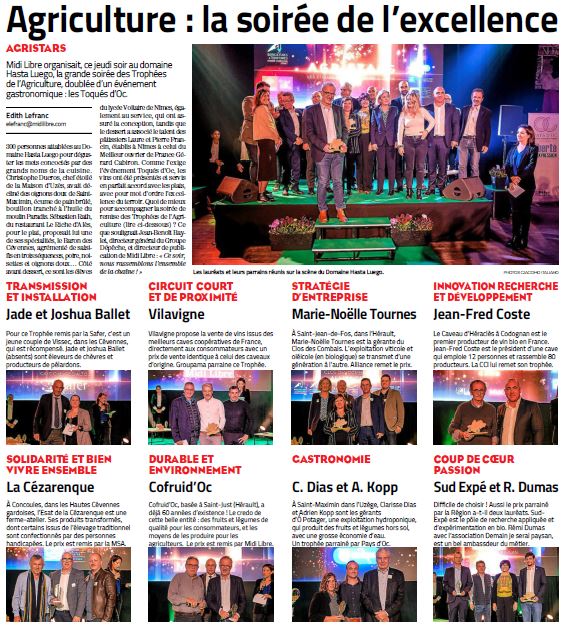 SudExpé est fier d’être un des Lauréats du prix « Coup de cœur » attribué par La Région Occitanie / Pyrénées-Méditerranée aux #AGRISTARS : trophées de l’agriculture qui ont permis de récompenser des démarches exemplaires qui contribuent à donner une image dynamique et positive de notre agriculture. 🏆